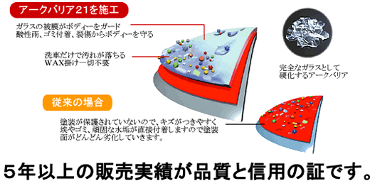 硬質なガラス被膜を形成する「アークバリア21」の施工行程、施工技術は独自に開発した特殊コーティング技術です。 |