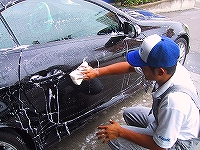 ボディ表面の汚れを洗剤で洗浄しながら、塗装面をチェック。